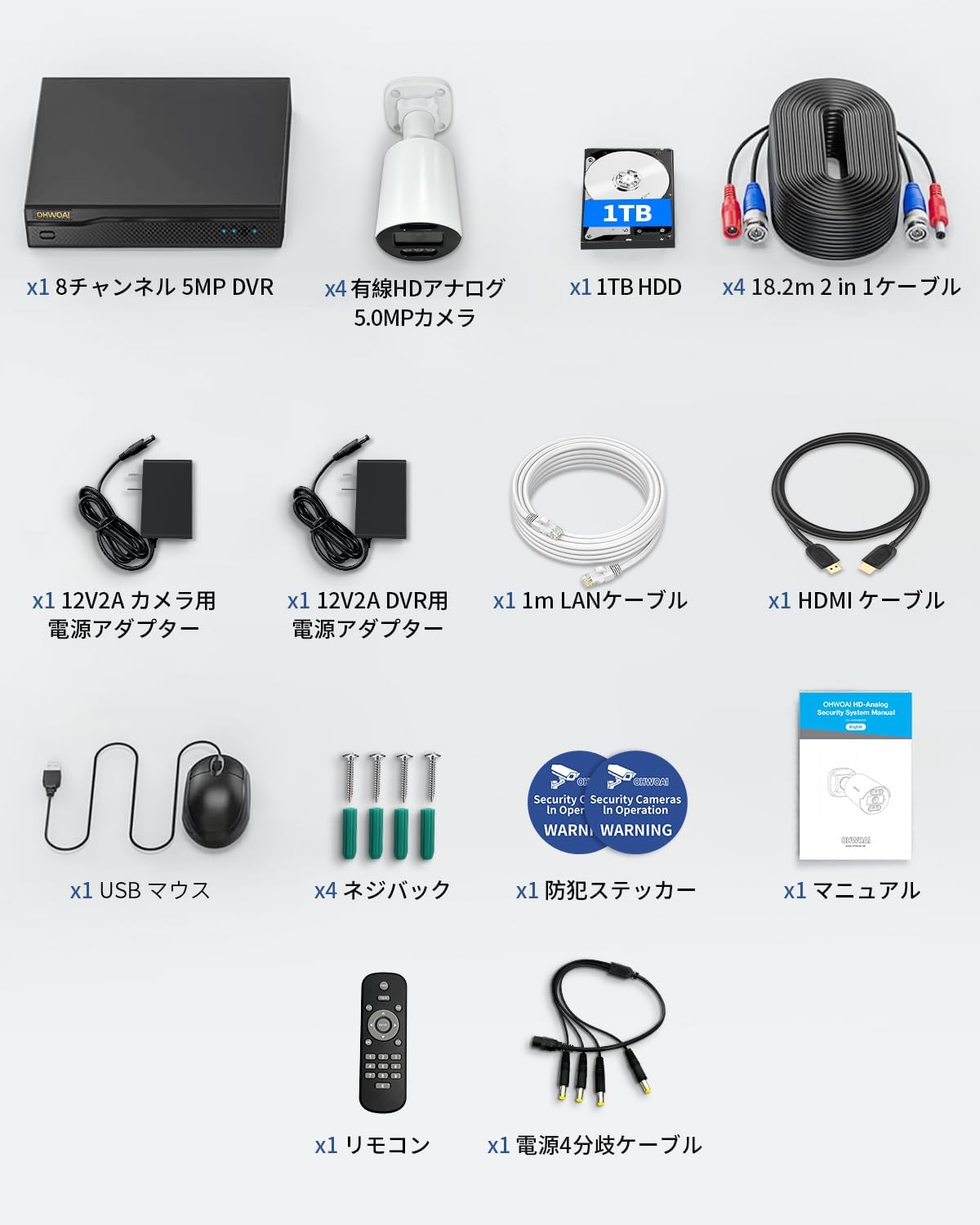 付属品 8チャンネルネットワークオーディオレコーダー*1 DVR用電源(DC12V 2A)*1 リモコン*1 マウス*1 HDMIケーブル*1 カメラ用2-in-1ケーブル18.2メートル*4 カメラネジセット*4 ネットワークケーブル1メートル*1 マニュアル*1 シール*2 防犯カメラ*4 カメラ電源4分歧ケーブル*1 |
