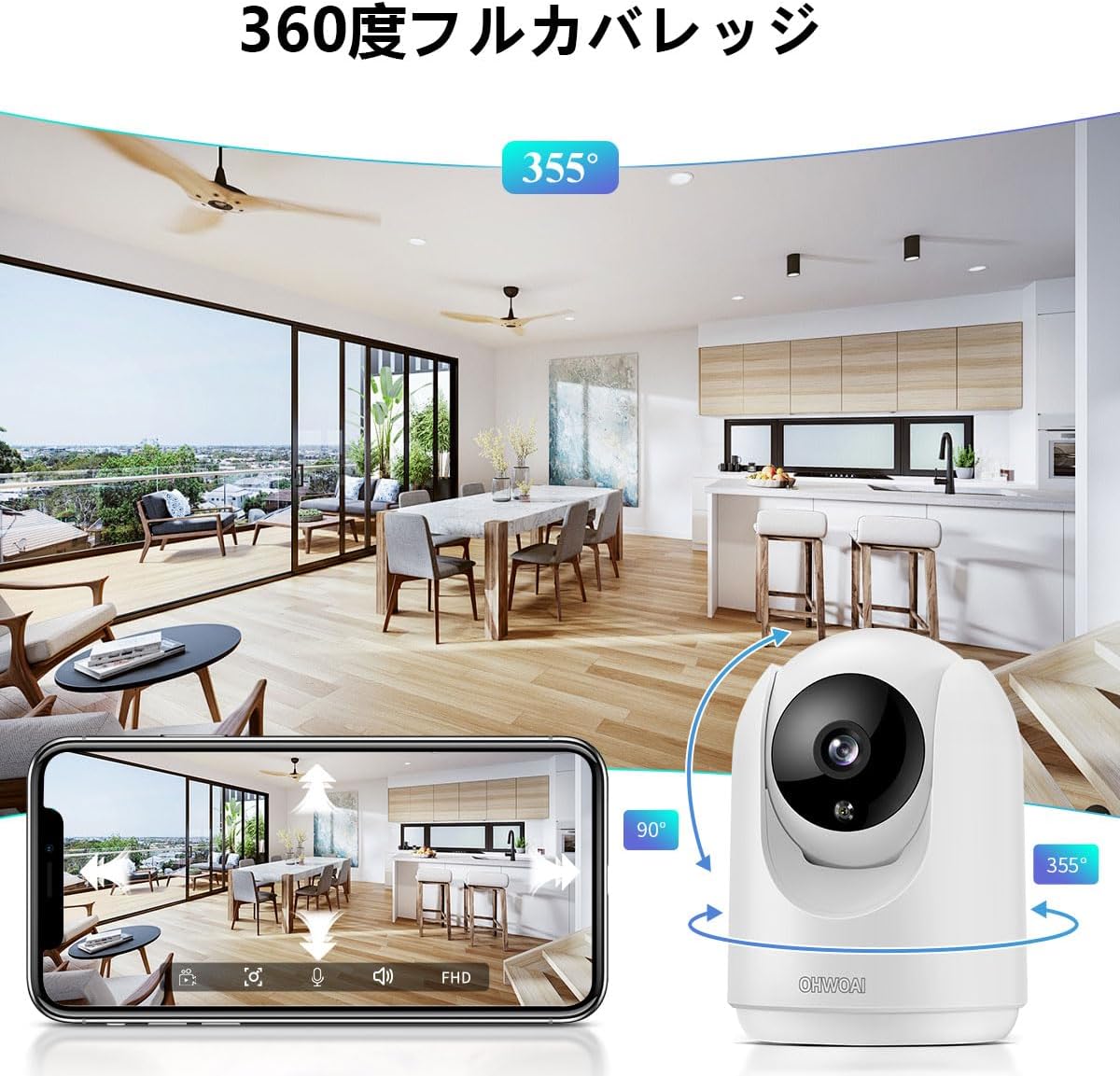 - ✅{パンチルト機能} 水平355度、垂直90度の広範囲をカバーする回転機能を備えており、家のどの角度からでも監視が可能です。これにより、家の安全を一層強化できます。